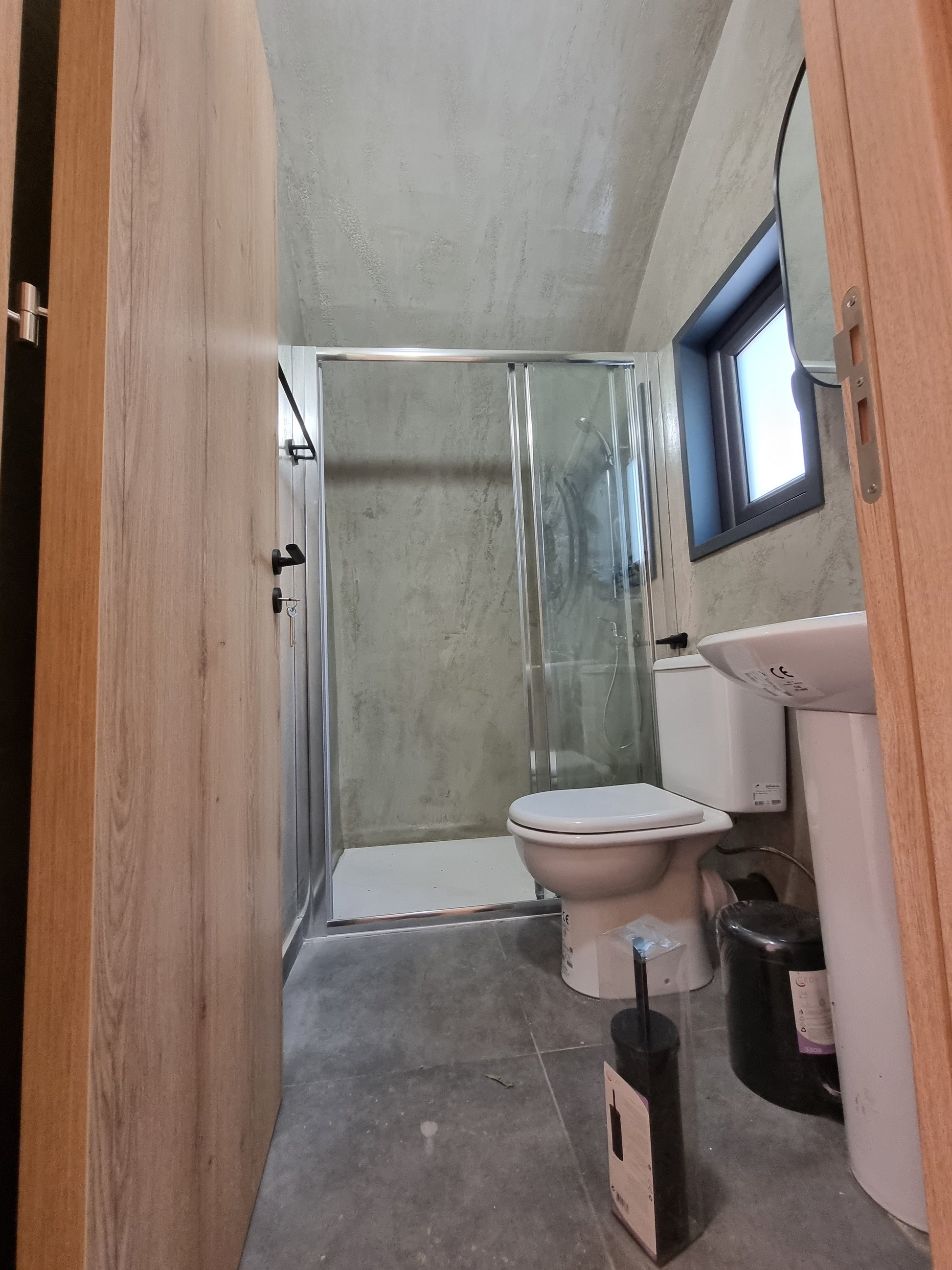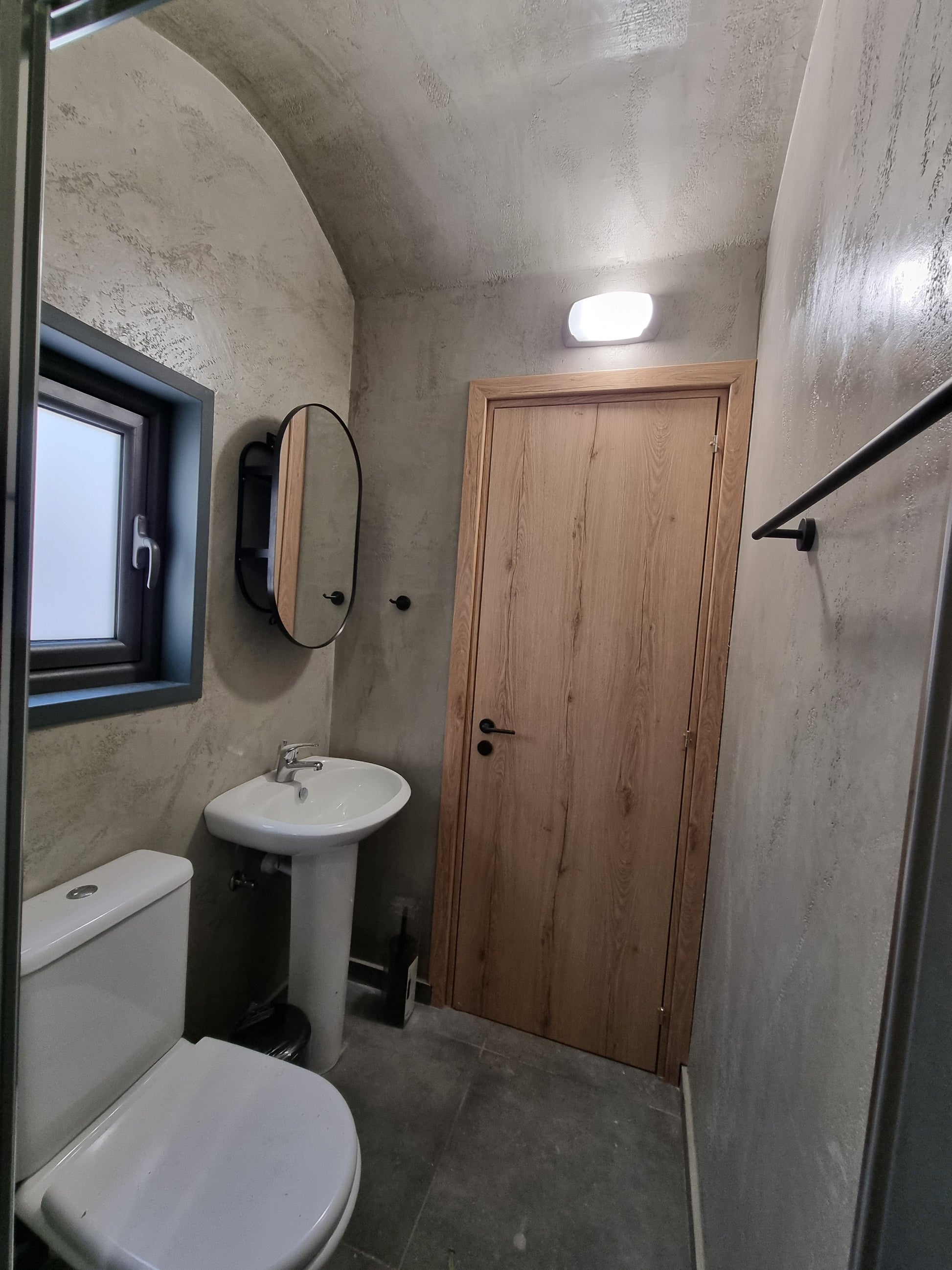 - WC/bathroom fit-out: exterior-grade fiberglass-reinforced drywall, full bathroom waterproofing, and installation of mechanical extract ventilation.