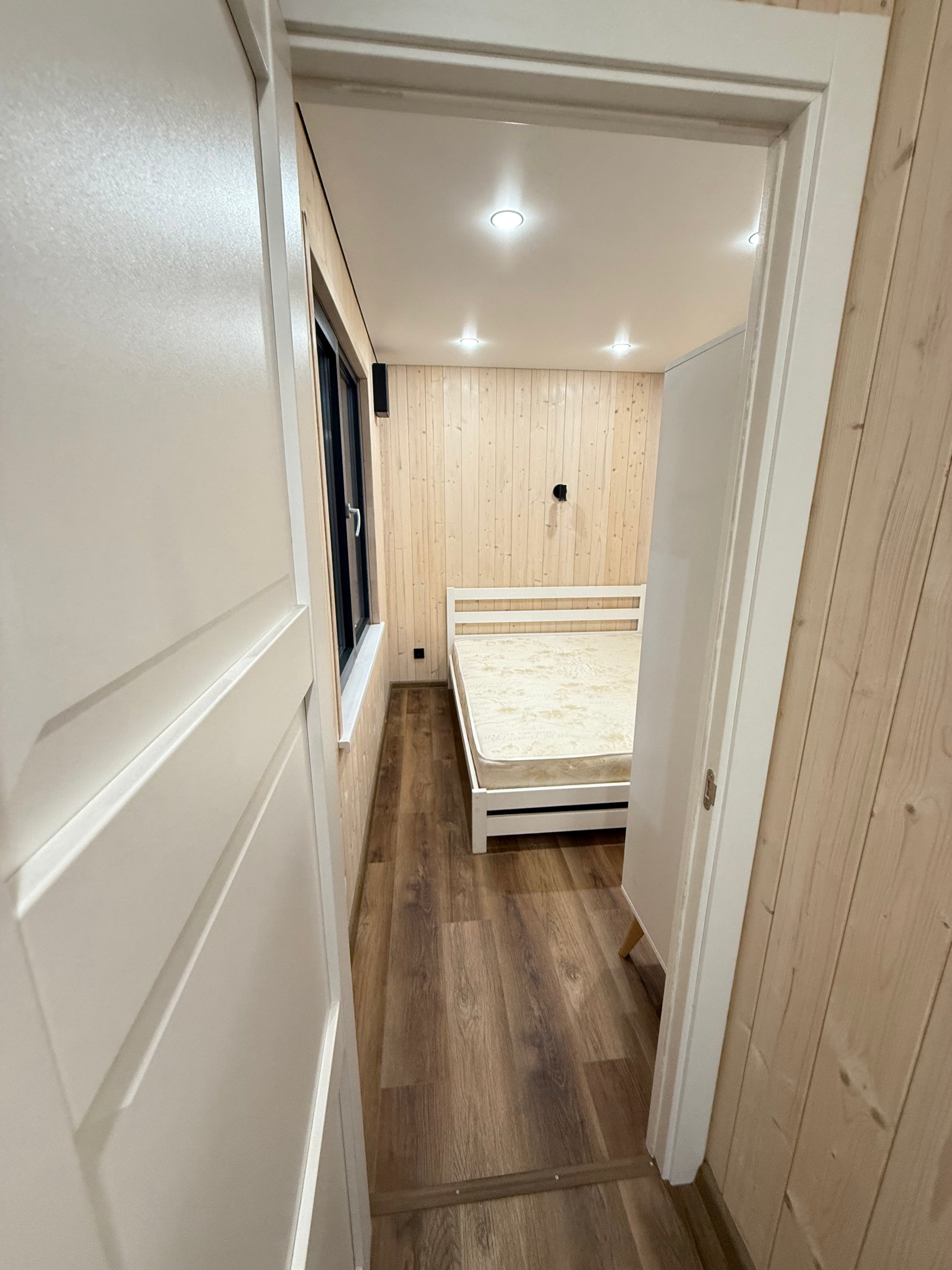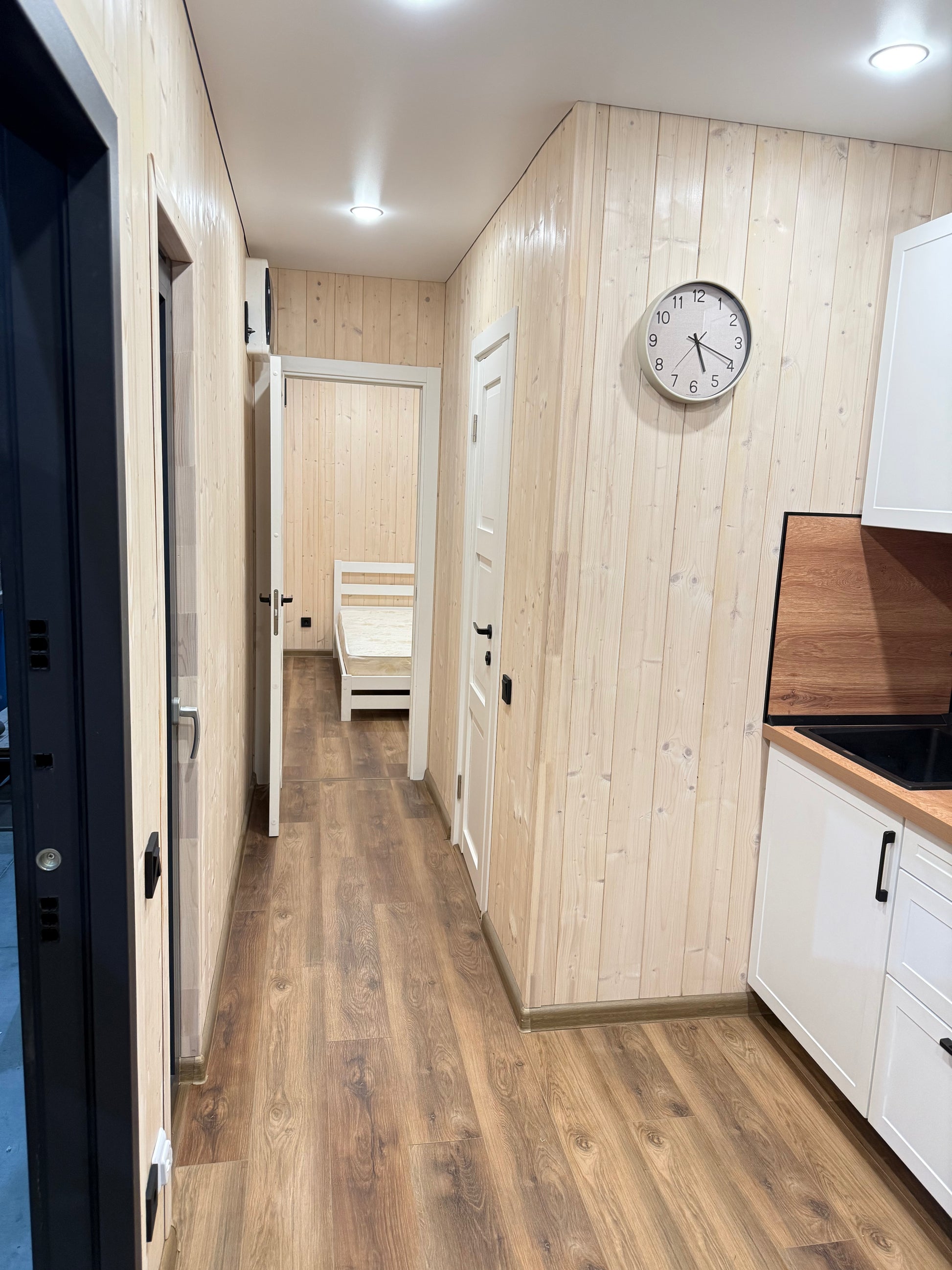 - Walls: filled with high-density PUF (35–40 kg/m³), clad with wooden panelling (imitation timber) and finished with clear lacquer for a light Scandinavian look