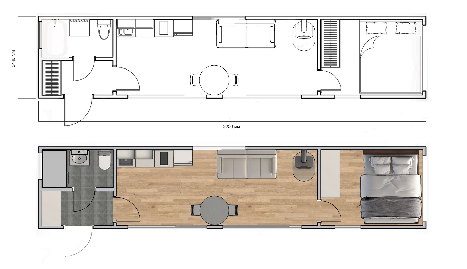 - Built-in cooktop and water heater (boiler)
