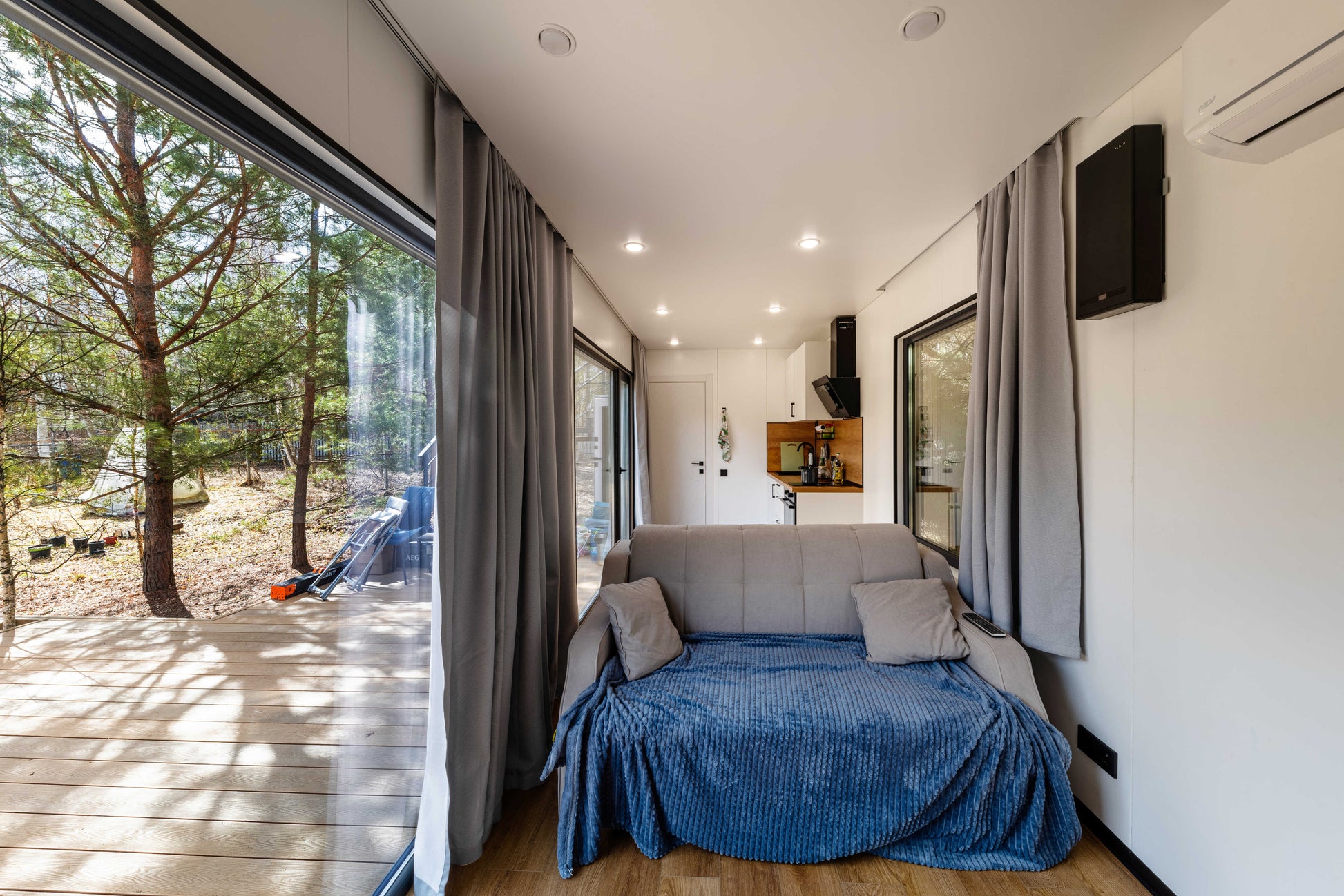 - UCB sheathing + stretch ceiling finish for a clean, modern look
