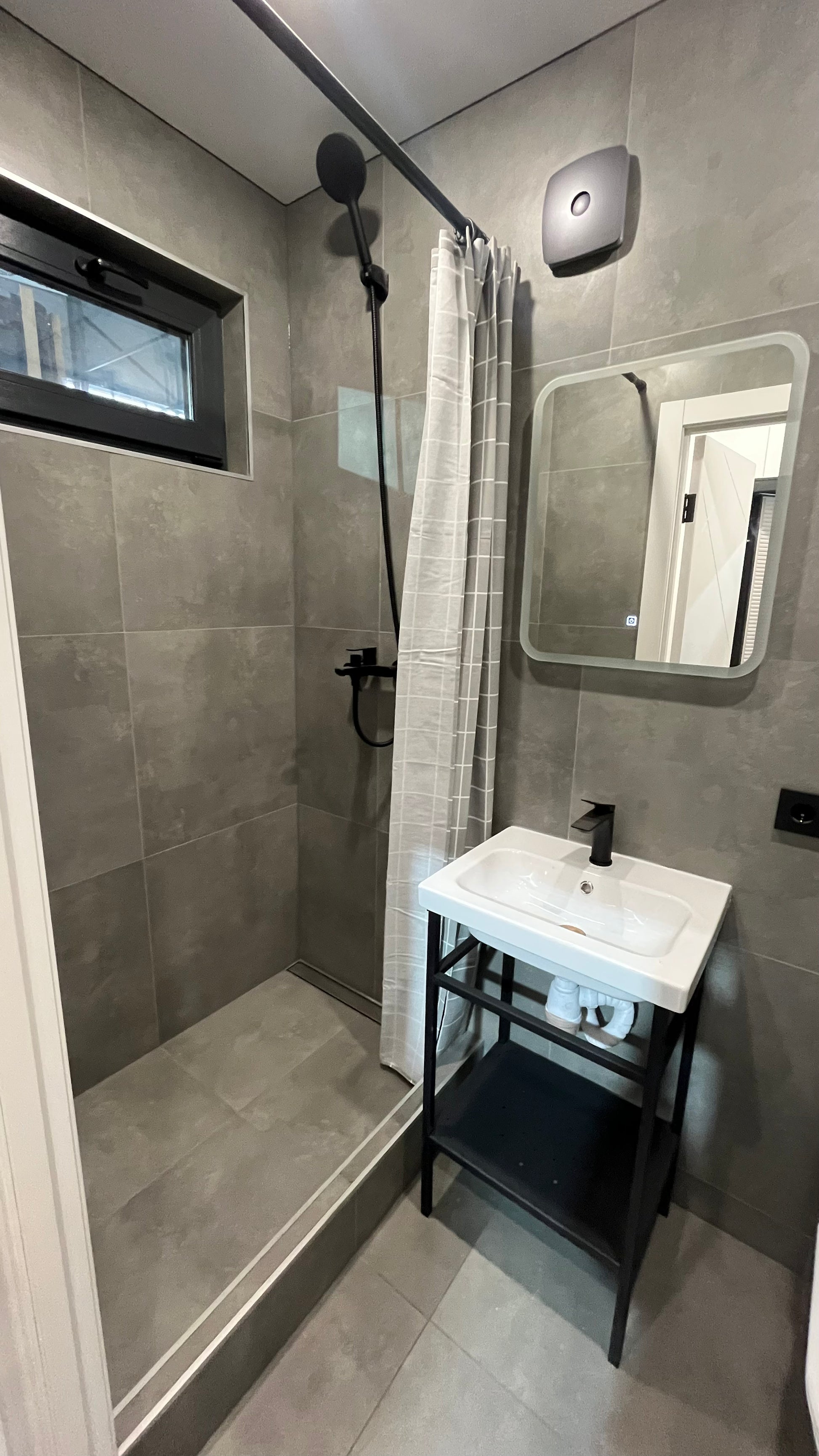 - Bathroom and shower area covered with premium ceramic tile